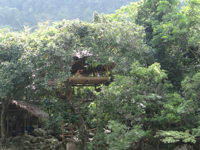 Nhà hàng "tổ chim" được thiết kế theo hình dáng chiếc tổ chim treo lơ lửng trên những thân cây cổ thụ cách mặt suối khoảng 5m, sử dụng vật liệu thân thiện với môi trường, như: tre, luồng, cọ...